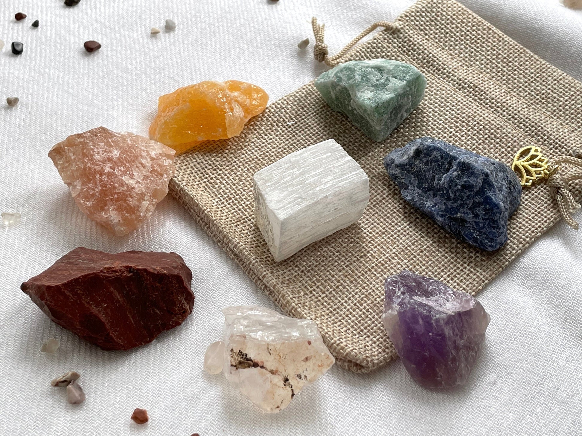 - 7-stone chakra crystals (Reiki-infused).