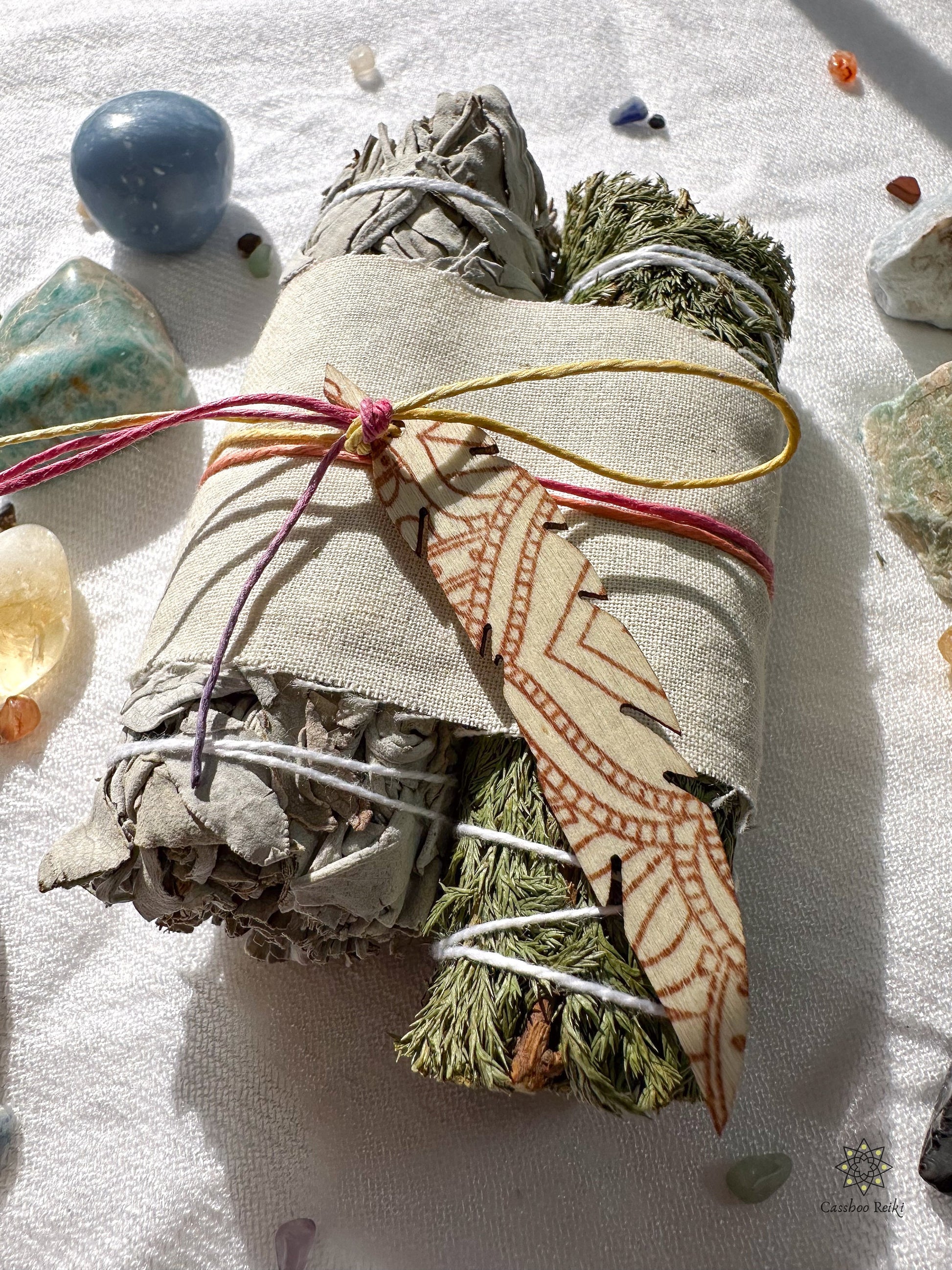 Your set includes 4 crystals, 2 smudge bundles, a velveteen pouch and an information card.