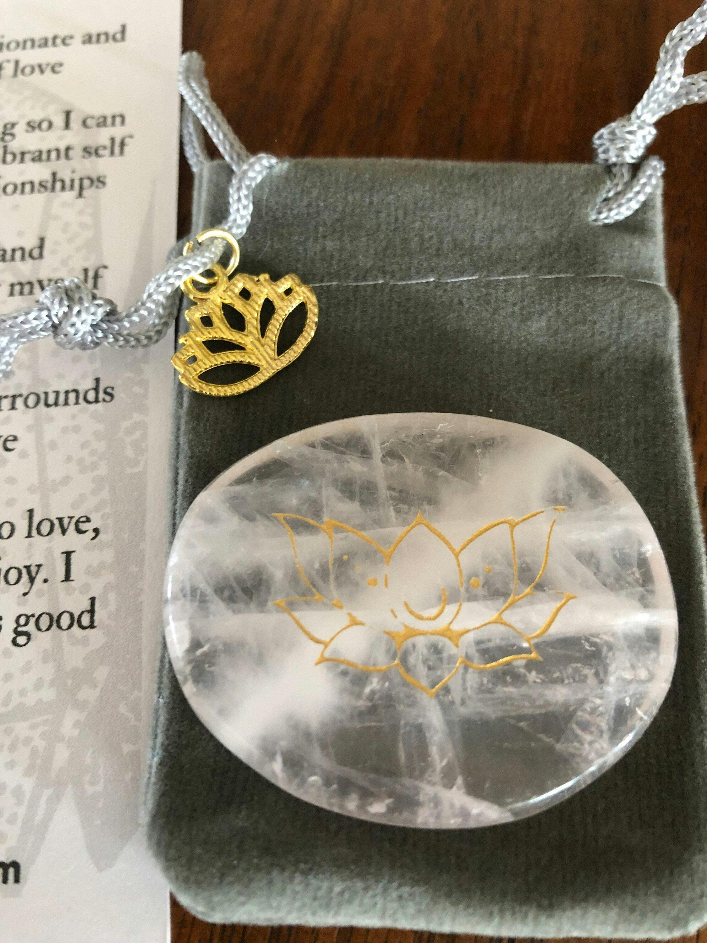 This is a lovely Rose Quartz Lotus pocket stone. It arrived with its own velvet pouch and a lovely Lotus charm. The owner also included a wonderful bookmark with information about Rose Quartz on one side and lovely affirmations on the other side. I highly recommend this terrific shop!
