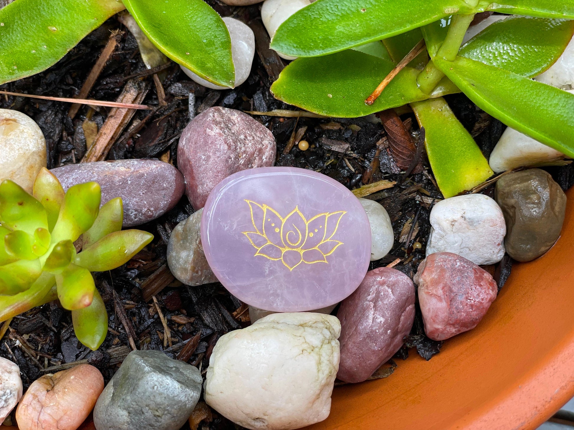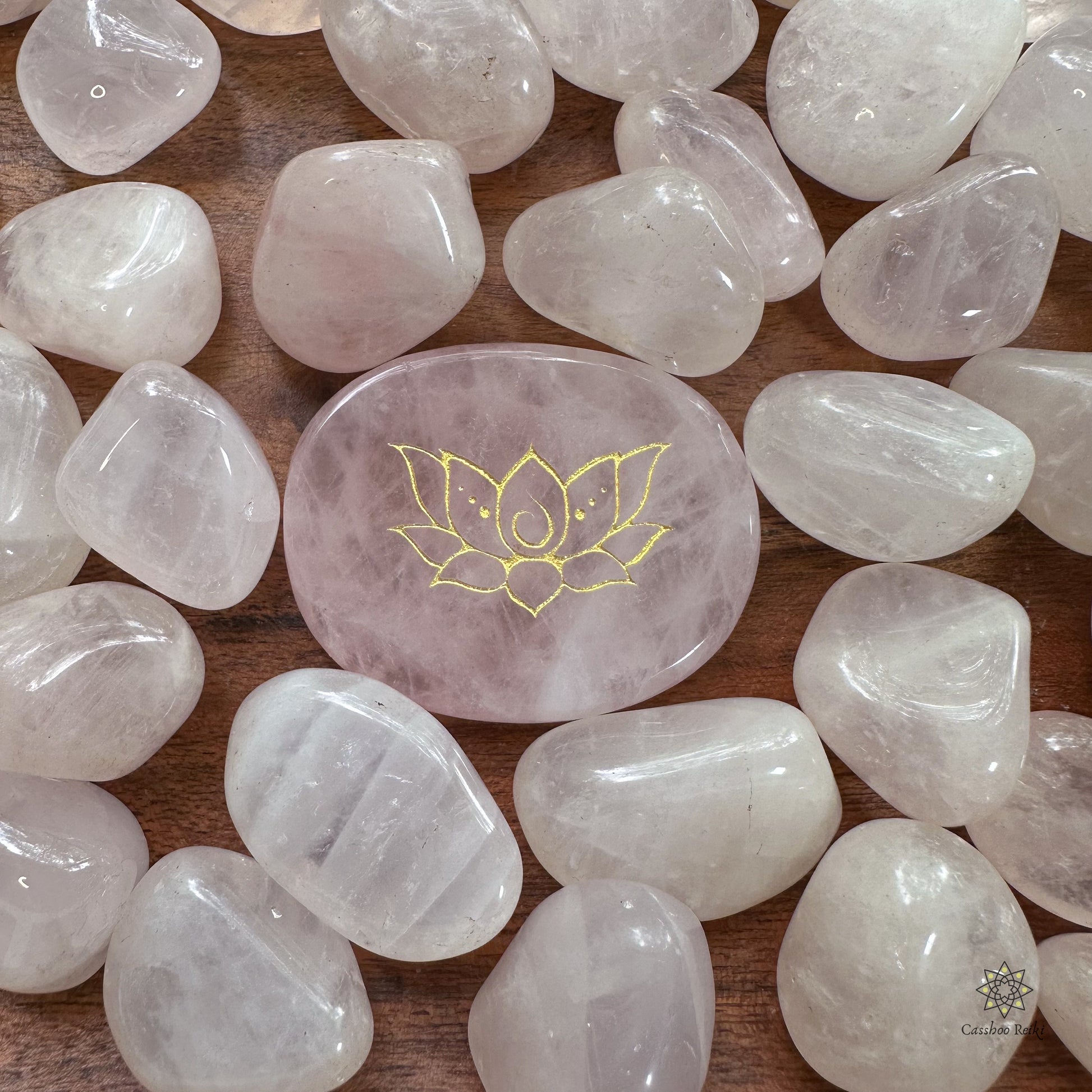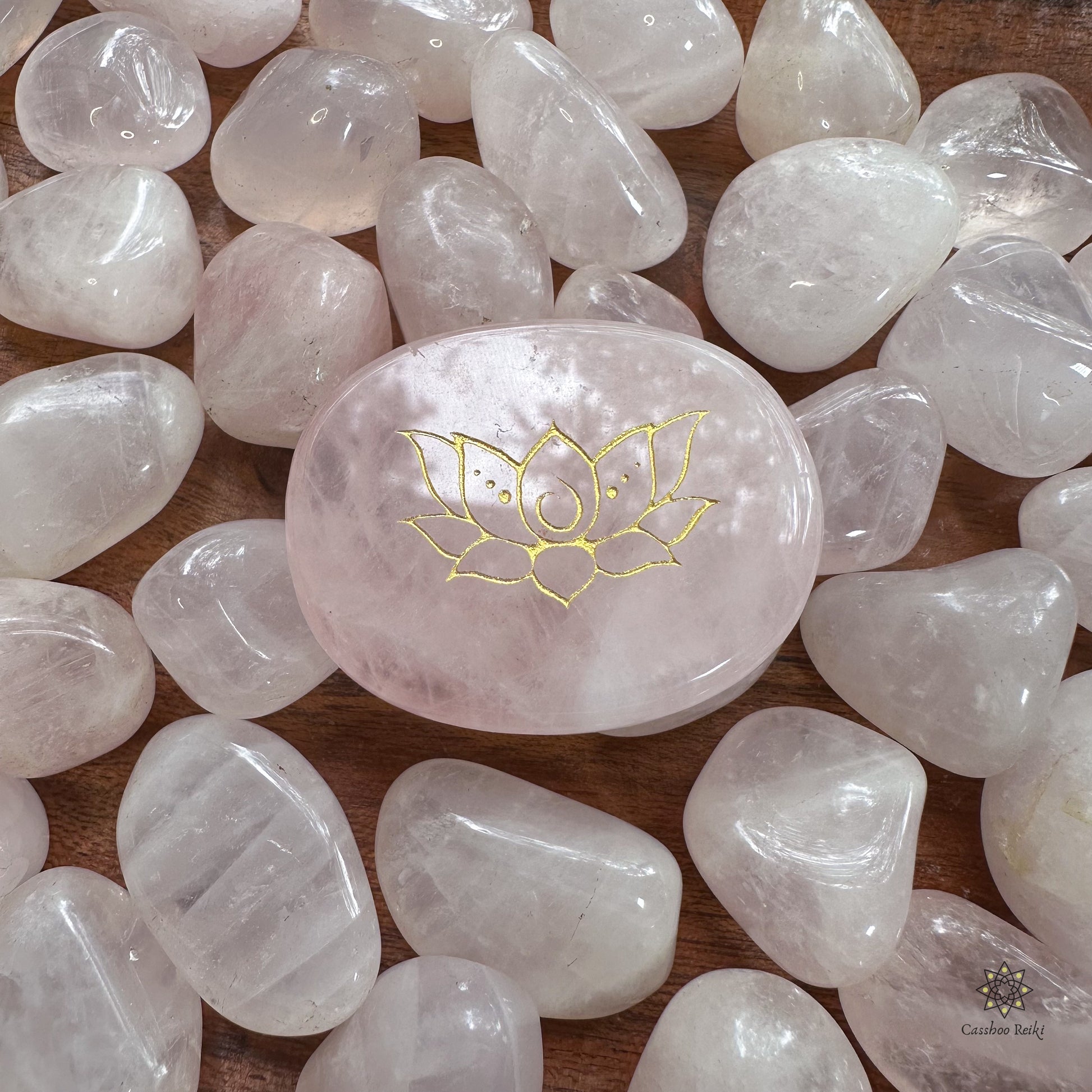 Engraved palm stone. Lotus flower in Rose Quartz
