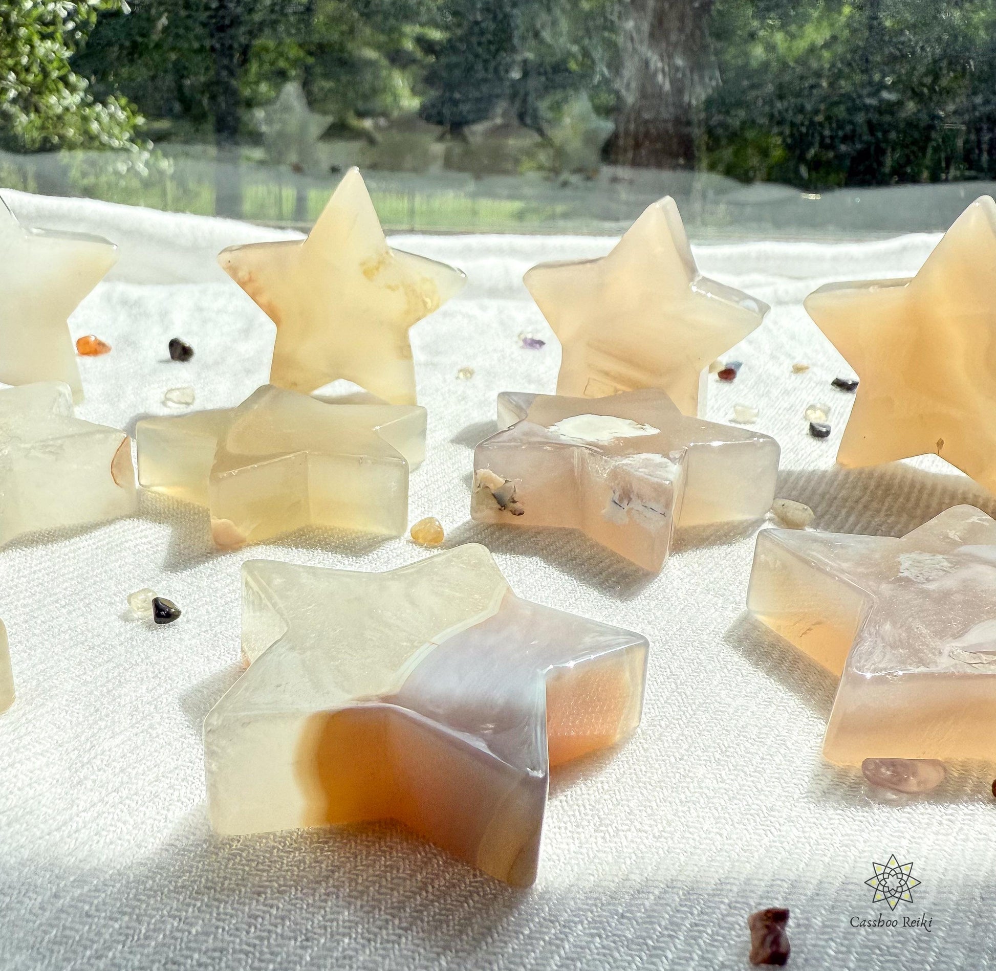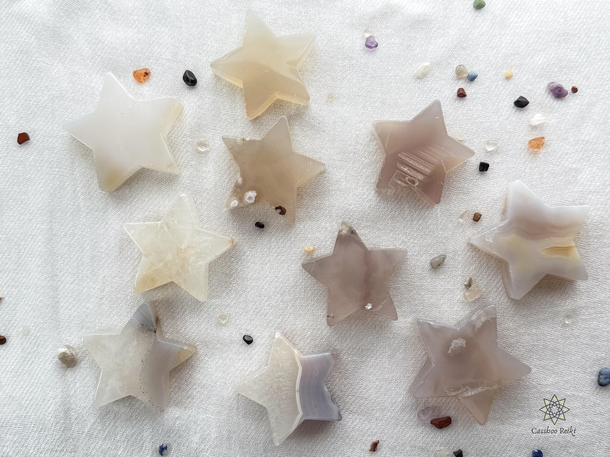 These beautiful stars are carved in natural agate. Some pieces show the matte, cloudy chalcedony spots typical of the Flower Agate texture.