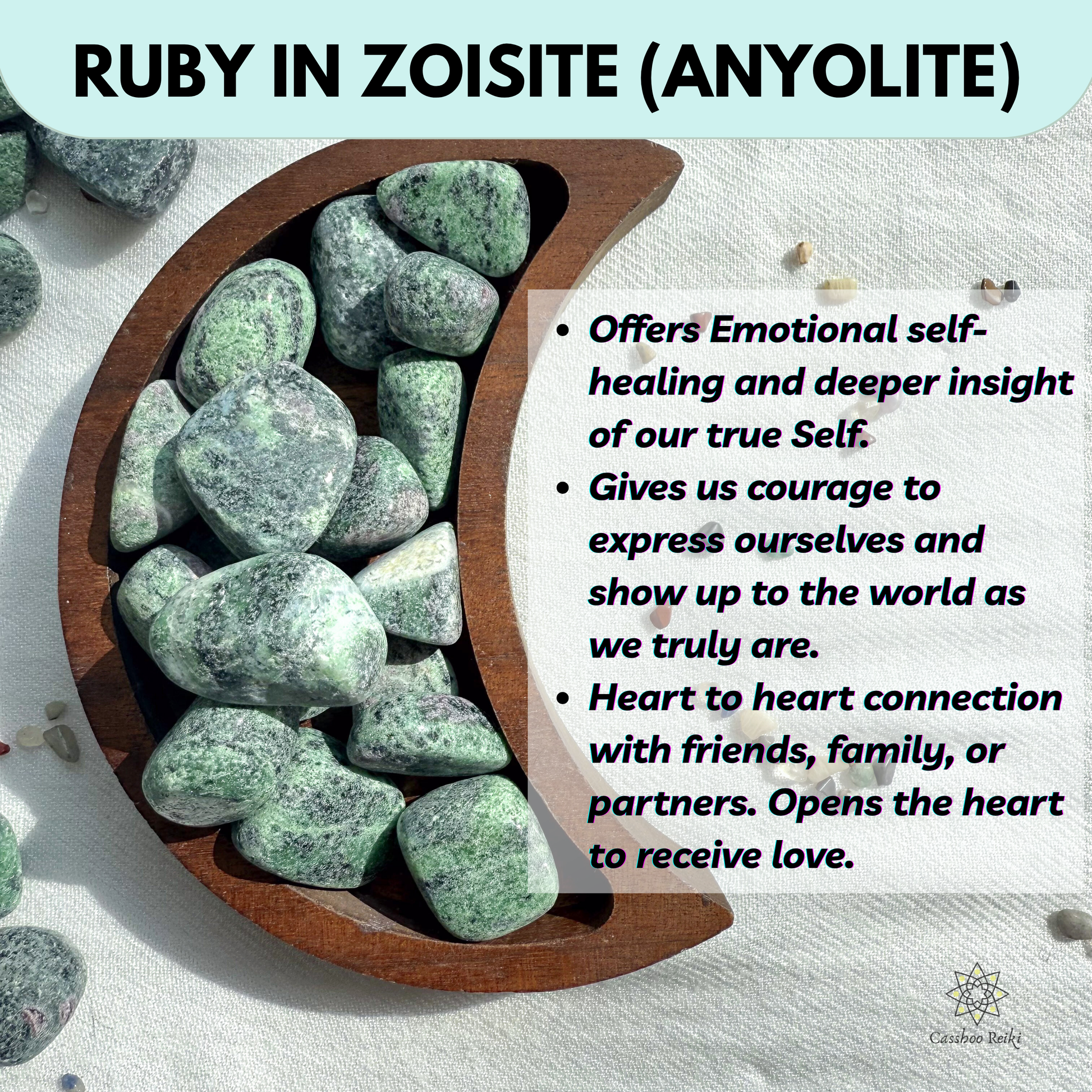 The green color of the zoisite works at the Heart level to help us get deeper insight and express ourselves from this important center. From this point of view, it inspires discovery and acceptance of those parts of our authentic selves that we may feel afraid to honor.