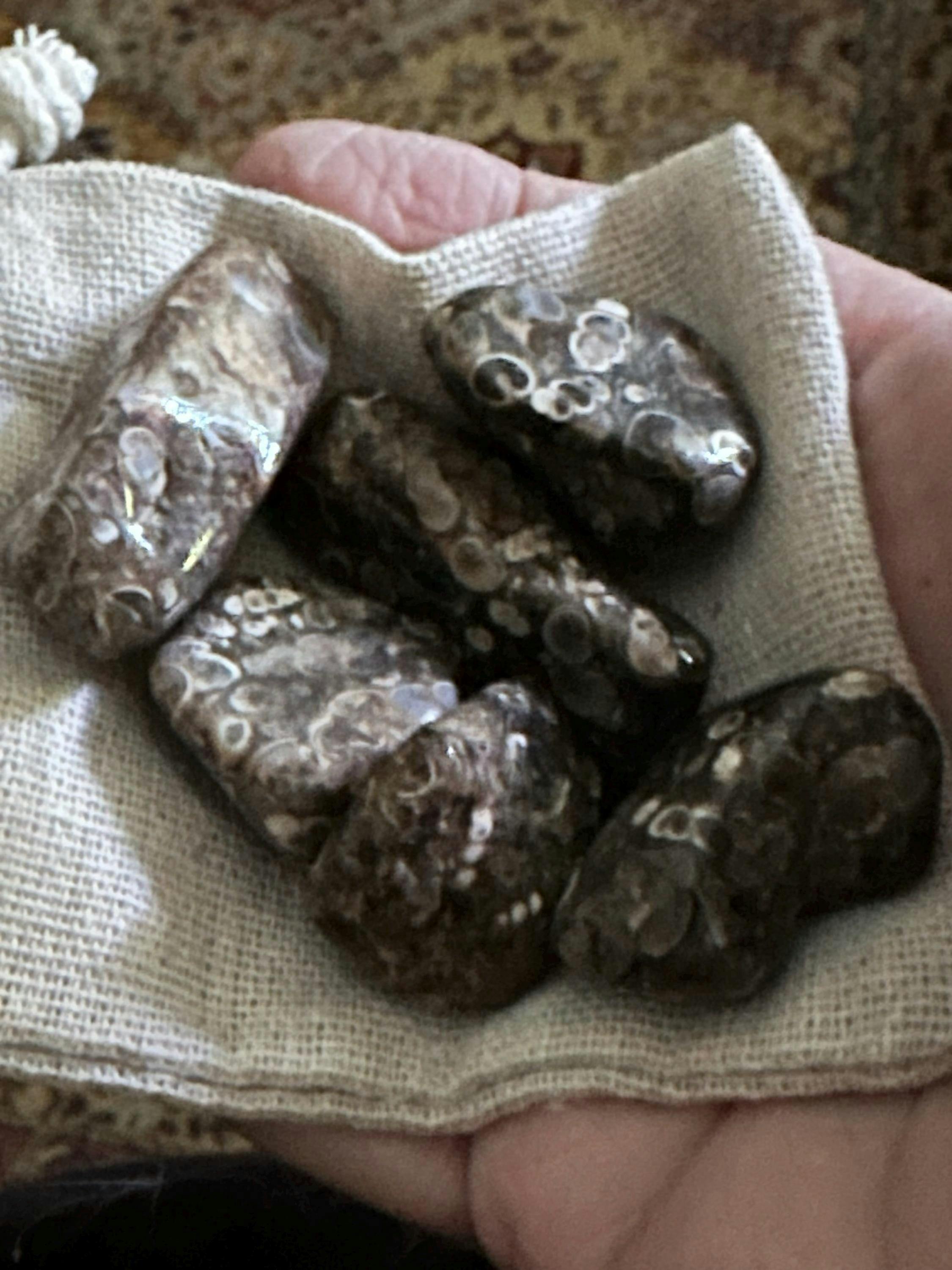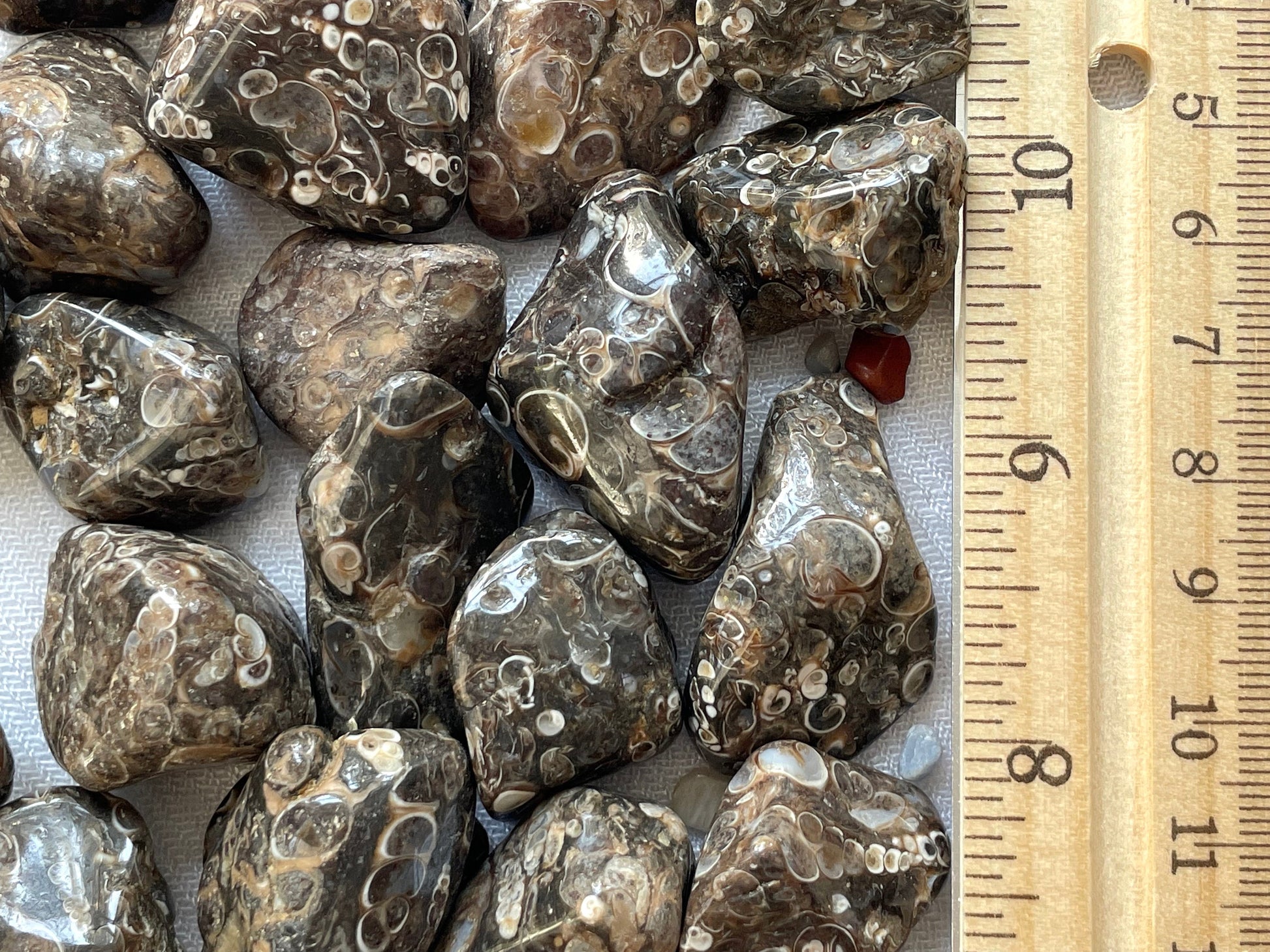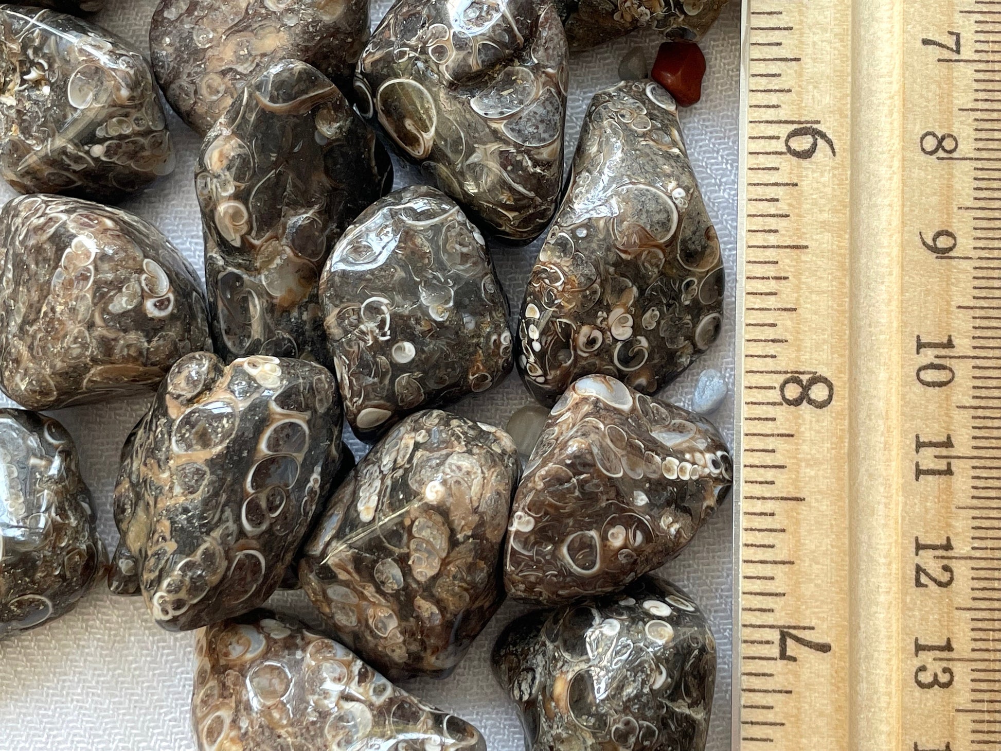 Fossilized turritella sea snails embedded in brown agate. Tumbled and polished.
