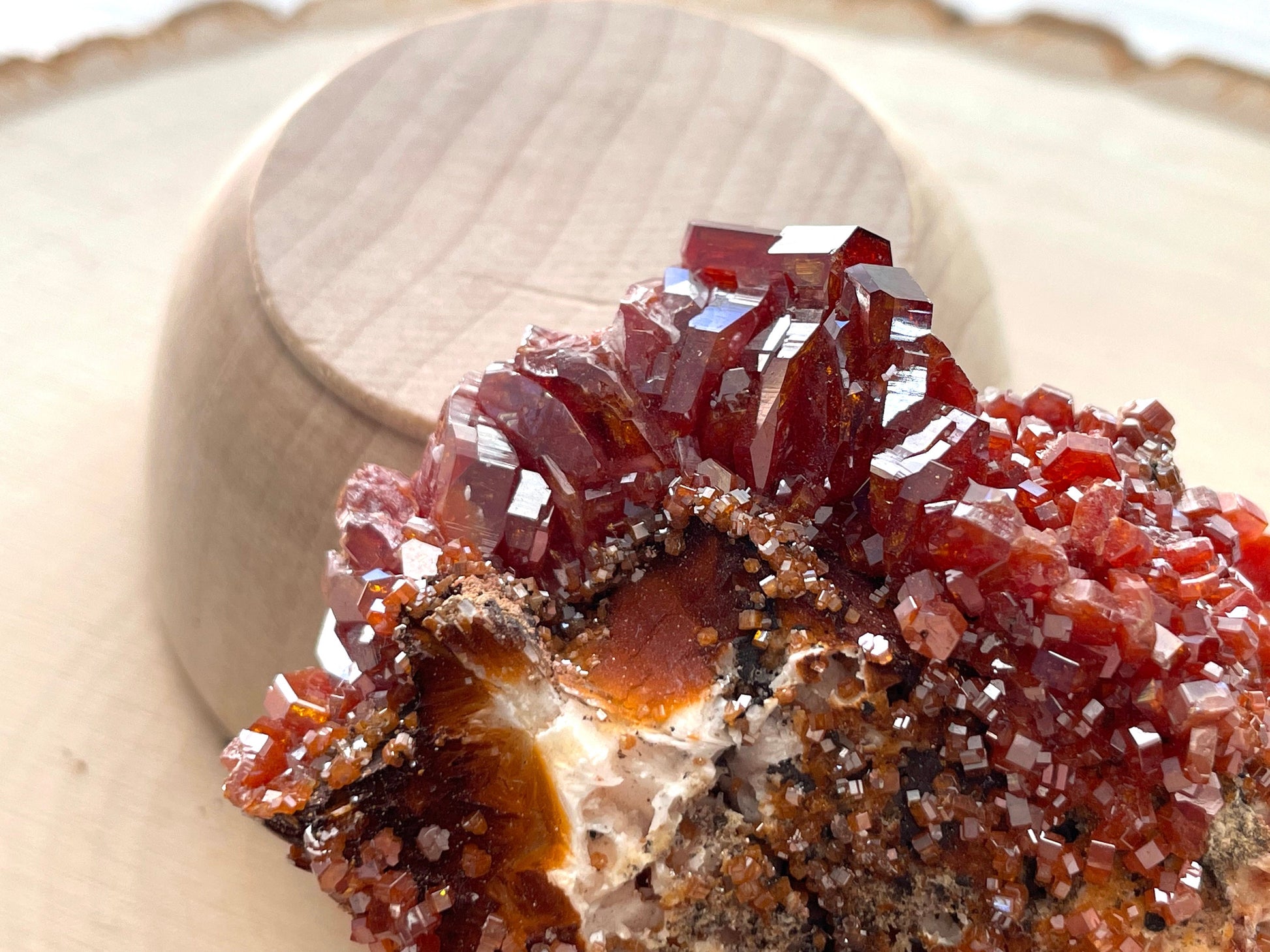 Vanadinite is a secondary mineral, meaning that a chemical process turns one mineral into vanadinite. Because of this, it is more uncommon than most minerals and is found in the oxidized zones of lead-bearing deposits.